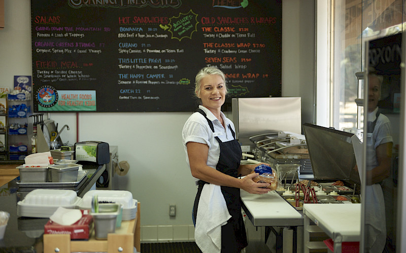 The outdoor seating area attached to our market is a fun place, with cafe vibes, where guests can find delicious house-made eats! Enjoy eating on the deck with grassy meadows and beautiful mountain views while nibbling on one of our handmade artisan sandwiches paired with our famous potato mac salad. Our staff creates a variety of fresh take-and-go foods daily for your convenience. Grab one of our hearty breakfast burritos and a cup of coffee in the morning or a fresh grilled panini for lunch. We offer a wide array of healthy snacks to enjoy during your visit but few can resist our hand scooped ice cream bar and scratch-made waffle cones!