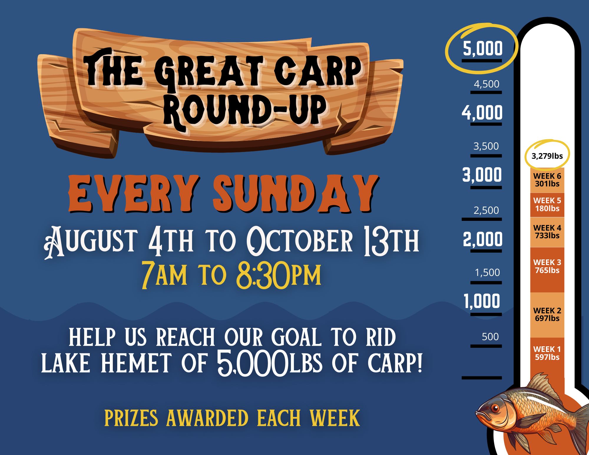 August 4 through October 13, join us at Lake Hemet for the Great Carp Round-Up! We are excited to announce what will be an ongoing effort over the next 11 weeks to clear a tremendous amount of carp out of Lake Hemet. We need your help to accomplish it.HERE ARE THE DETAILS:Every Sunday both day use guests and overnight campers are invited to participate in a carp catching derby to remove as many carp as possible. HOURS: Derby will run from 7am to 10pmCOST: Registration is FREE. Day Use guests still pay $25 per vehicle entry fee. WHO? Anglers of all ages. WHAT? All day carp derby with prizes for registrants who collect the most carp that day. WHERE? Carp derby will take place in a specific area where there is a large concentration of carp at Lake Hemet. WHY? The amount of carp we have are negatively impacting the lake and it’s time to make a concerted effort to rid the lake of as many as possible.